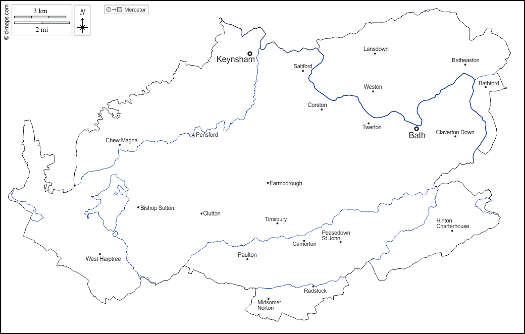 Bath, Batheaston, Bathford, Bishop Sutton, Camerton, Chew Magna, Claverton Down, Clutton, Corston, Farmborough, Hinton Charterhouse, Keynsham, Lansdown, Midsomer Norton, Paulton, Peasedown St John, Pensford, Radstock, Saltford, Timsbury, Twerton, West Harptree, Weston.