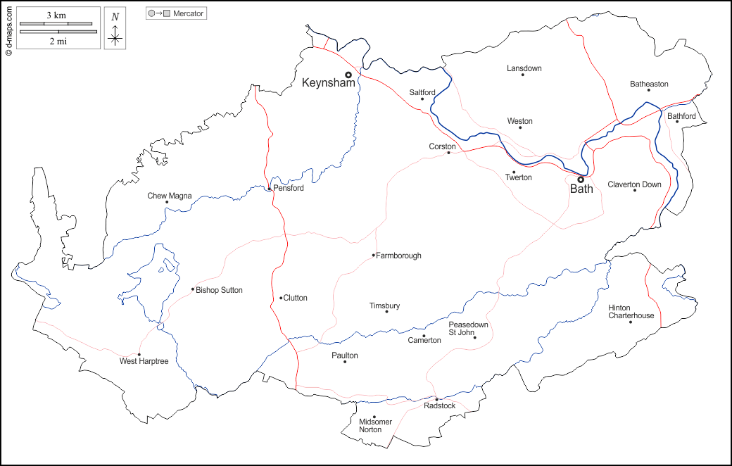 यूरोप > युनाइटेड किंगडम > स्नान और उत्तर पूर्व सोमरसेट > बाह्यरेखा, जल-सर्वेक्षण, मुख्य शहरों, सड़कों, नाम, सफेद
