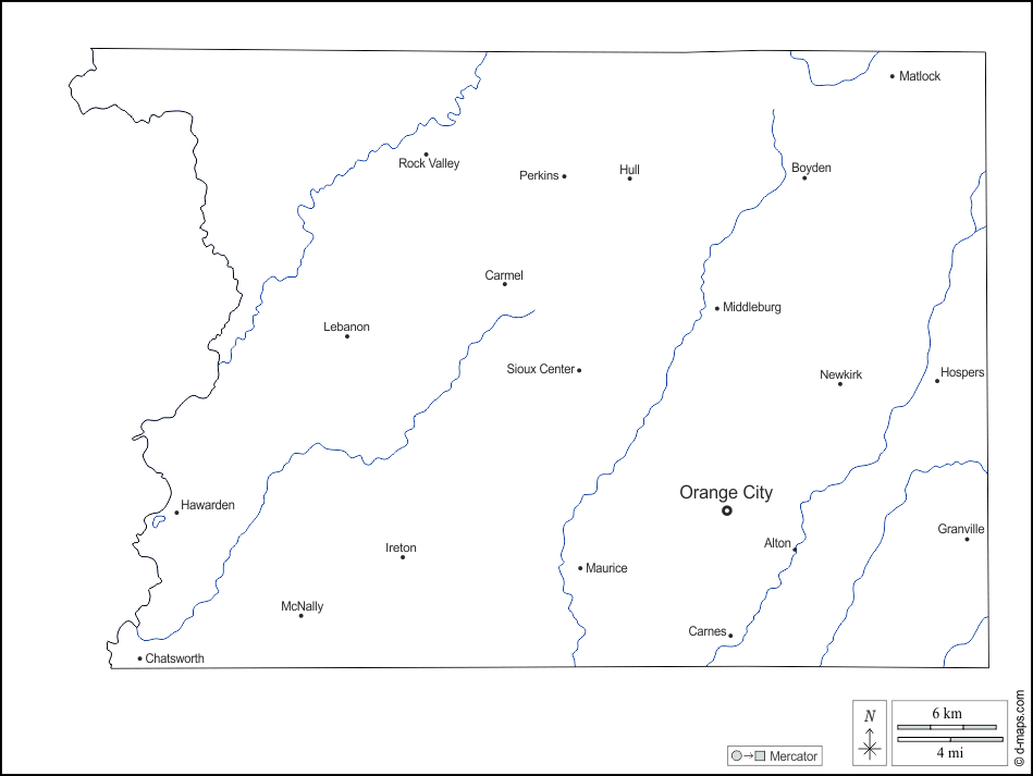 d-maps > संयुक्त राज्य > आयोवा > सिओक्स काउंटी > बाह्यरेखा, जल-सर्वेक्षण, मुख्य शहरों, नाम, सफेद