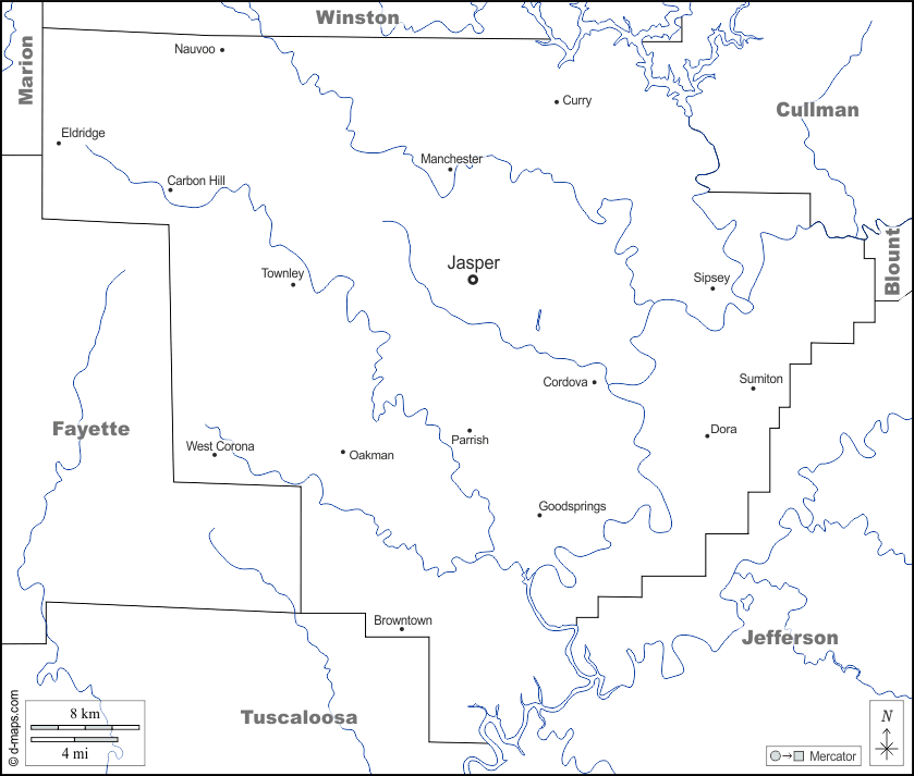 d-maps > संयुक्त राज्य > अलबामा > वॉकर काउंटी > सीमाओं, जल-सर्वेक्षण, मुख्य शहरों, नाम, सफेद