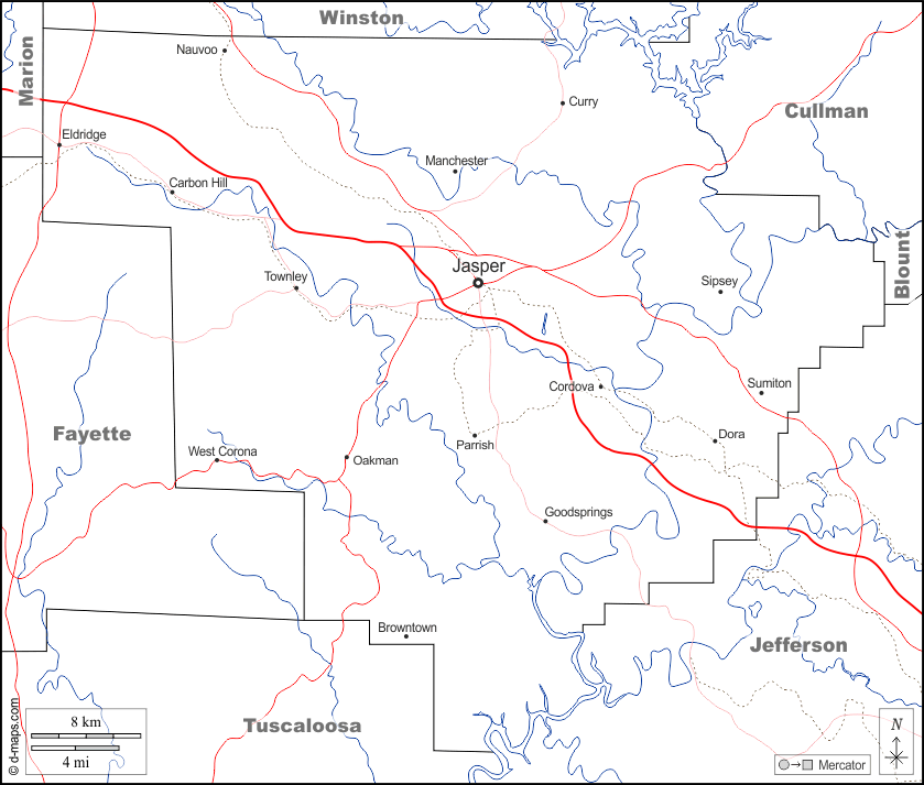 d-maps > संयुक्त राज्य > अलबामा > वॉकर काउंटी > सीमाओं, जल-सर्वेक्षण, मुख्य शहरों, सड़कों, नाम, सफेद