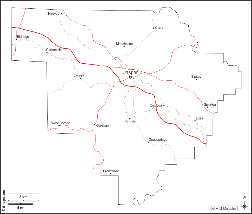 d-maps > संयुक्त राज्य > अलबामा > वॉकर काउंटी > बाह्यरेखा, मुख्य शहरों, सड़कों, नाम, सफेद