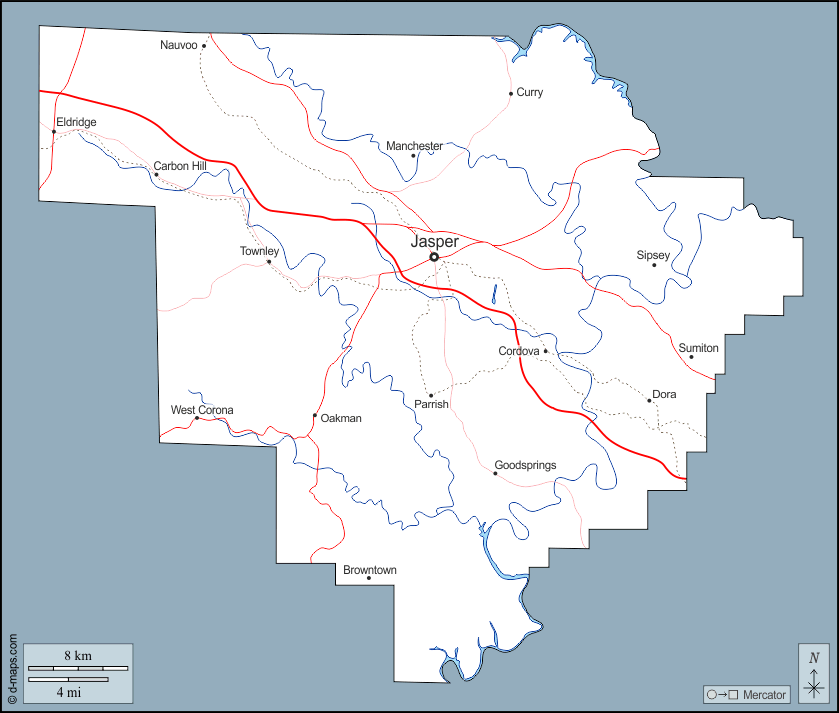d-maps > संयुक्त राज्य > अलबामा > वॉकर काउंटी > बाह्यरेखा, जल-सर्वेक्षण, मुख्य शहरों, सड़कों, नाम