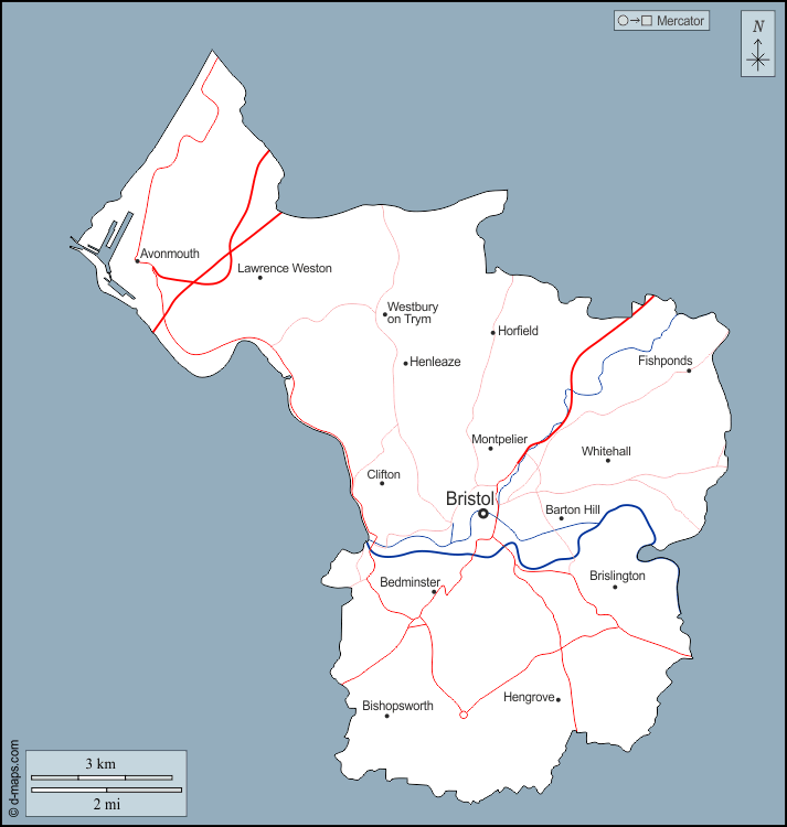 d-maps > यूरोप > युनाइटेड किंगडम > ब्रिस्टल > बाह्यरेखा, जल-सर्वेक्षण, पड़ोस, सड़कों, नाम