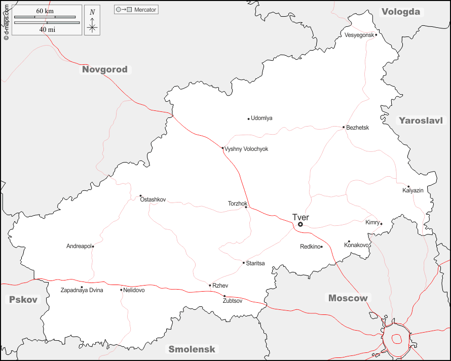 d-maps > यूरोप > रूस > त्वेर ओब्लास्ट > सीमाओं, मुख्य शहरों, सड़कों, नाम