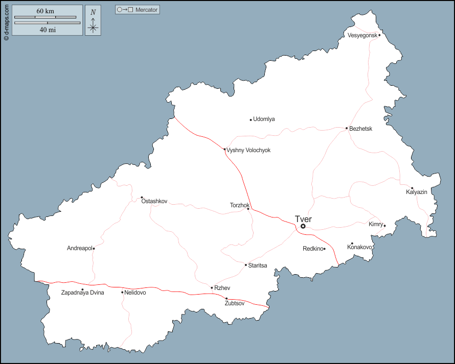 d-maps > यूरोप > रूस > त्वेर ओब्लास्ट > बाह्यरेखा, मुख्य शहरों, सड़कों, नाम