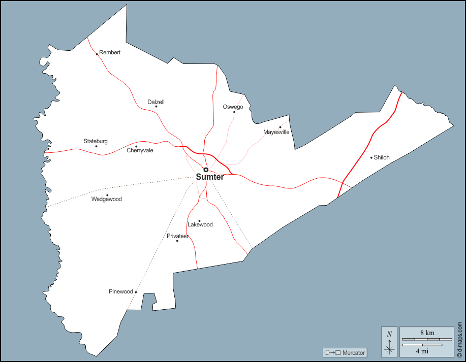 d-maps > संयुक्त राज्य > नॉर्थ कैरोलीना > सुम्टर काउंटी > बाह्यरेखा, मुख्य शहरों, सड़कों, नाम
