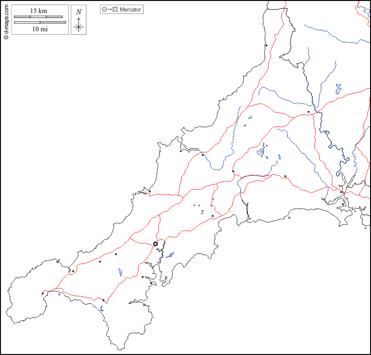 यूरोप > युनाइटेड किंगडम > कॉर्नवाल > सीमाओं, जल-सर्वेक्षण, मुख्य शहरों, सड़कों, सफेद