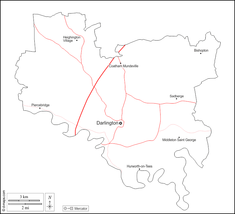 d-maps > यूरोप > युनाइटेड किंगडम > डार्लिंगटन > बाह्यरेखा, मुख्य शहरों, सड़कों, नाम, सफेद