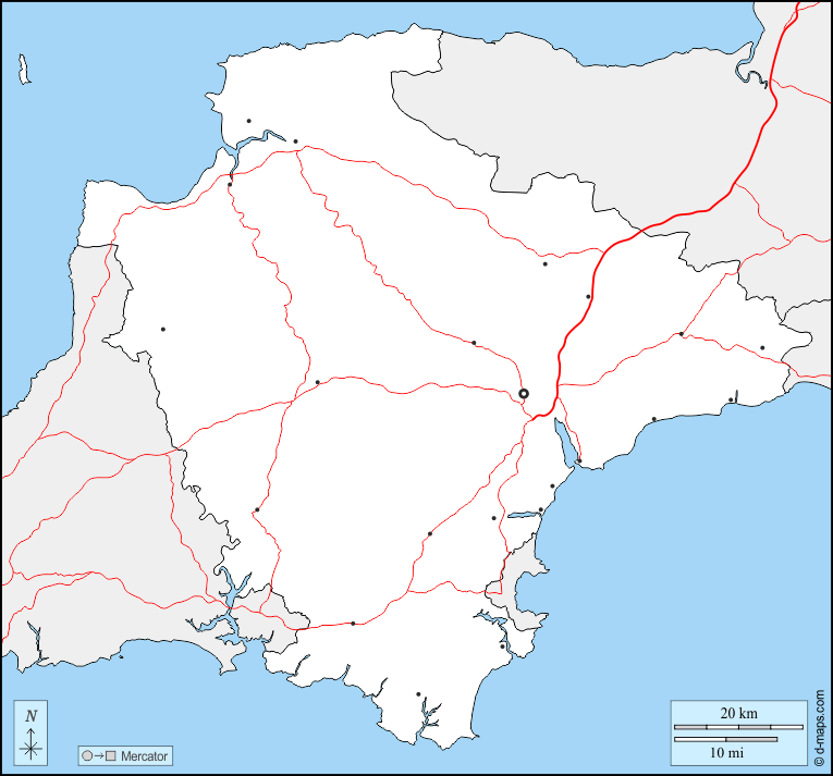 यूरोप > युनाइटेड किंगडम > डेवन > सीमाओं, मुख्य शहरों, सड़कों