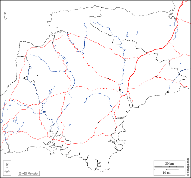 यूरोप > युनाइटेड किंगडम > डेवन > सीमाओं, जल-सर्वेक्षण, मुख्य शहरों, सड़कों, सफेद