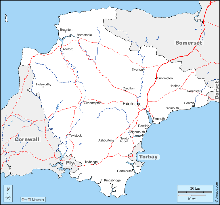 यूरोप > युनाइटेड किंगडम > डेवन > सीमाओं, जल-सर्वेक्षण, मुख्य शहरों, सड़कों, नाम