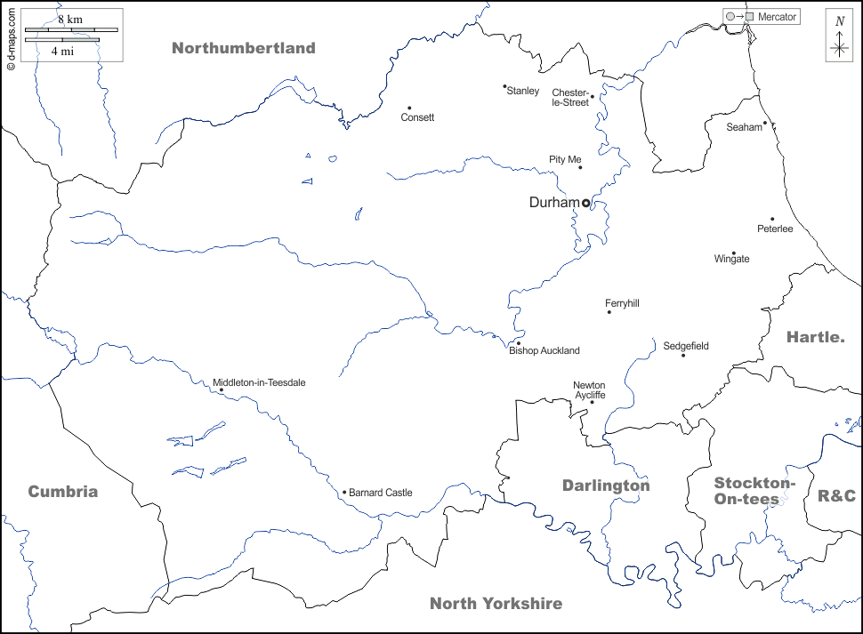 d-maps > यूरोप > युनाइटेड किंगडम > डरहम > सीमाओं, जल-सर्वेक्षण, मुख्य शहरों, नाम, सफेद
