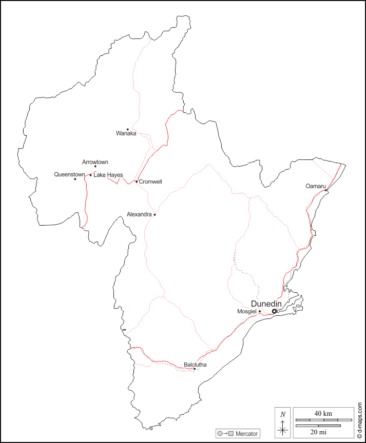 d-maps > ओशिनिया > ओटागो क्षेत्र > बाह्यरेखा, मुख्य शहरों, सड़कों, नाम, सफेद