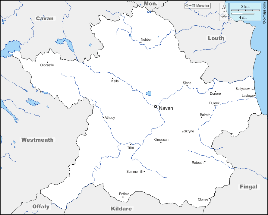 d-maps > यूरोप > आयरलैण्ड गणतंत्र > काउंटी मीथ > सीमाओं, जल-सर्वेक्षण, मुख्य शहरों, नाम