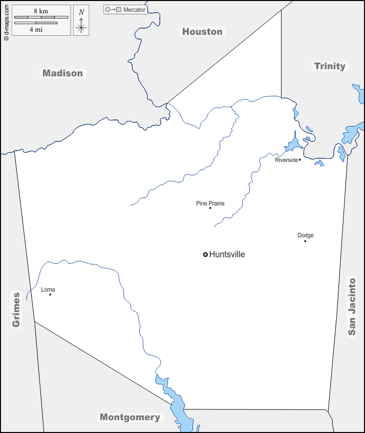 d-maps > संयुक्त राज्य > टेक्सास > वॉकर काउंटी > सीमाओं, जल-सर्वेक्षण, मुख्य शहरों, नाम