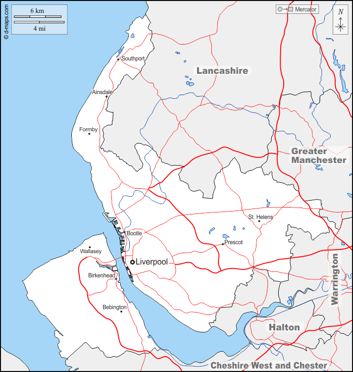 d-maps > यूरोप > युनाइटेड किंगडम > मर्सीसाइड > सीमाओं, जल-सर्वेक्षण, मुख्य शहरों, सड़कों, नाम