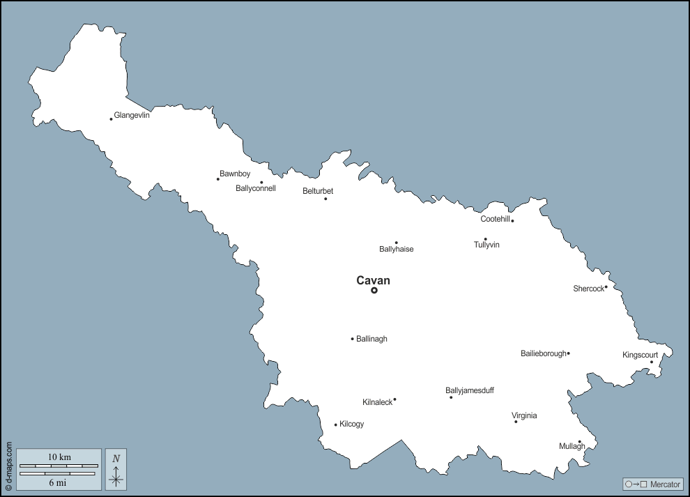 d-maps > यूरोप > आयरलैण्ड गणतंत्र > कैवन > बाह्यरेखा, मुख्य शहरों, नाम