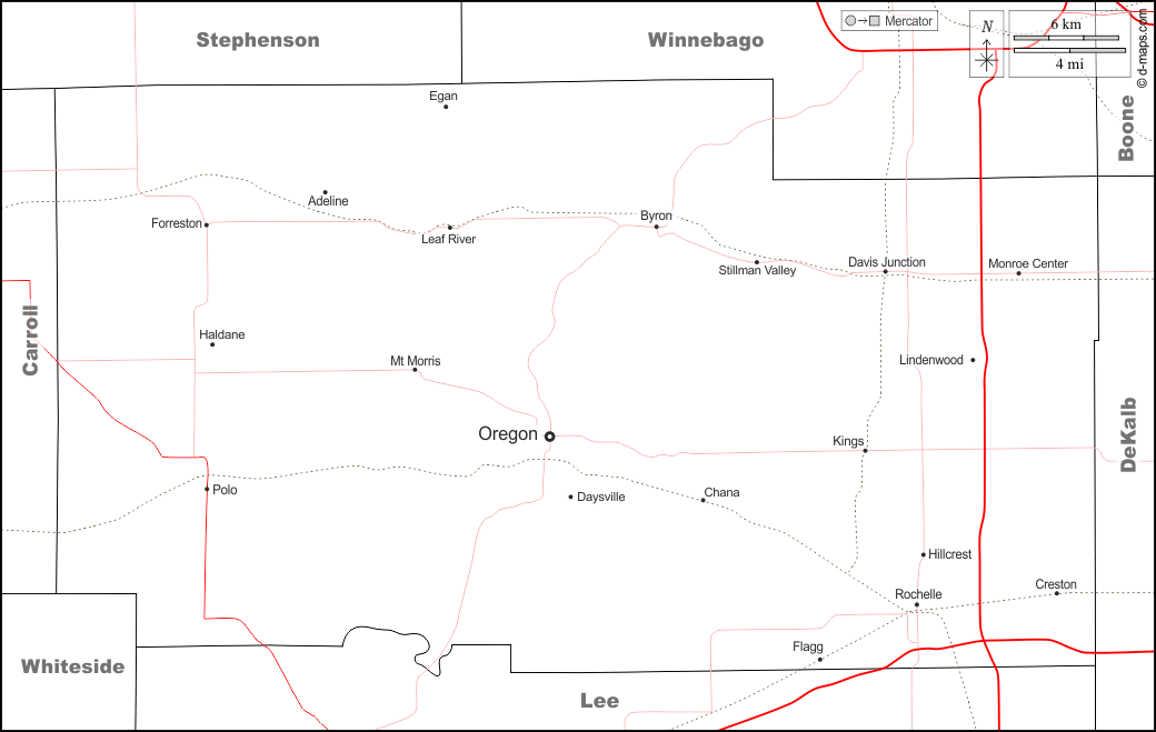 d-maps > संयुक्त राज्य > इलिनॉय > ओगली काउंटी > सीमाओं, मुख्य शहरों, सड़कों, नाम, सफेद