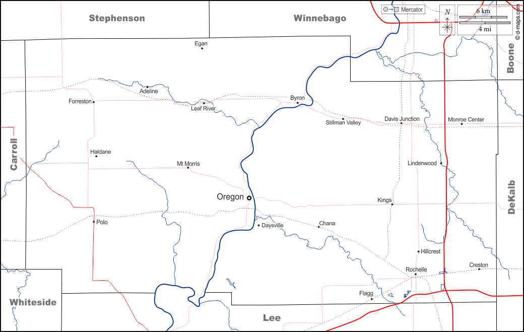 d-maps > संयुक्त राज्य > इलिनॉय > ओगली काउंटी > सीमाओं, जल-सर्वेक्षण, मुख्य शहरों, सड़कों, नाम, सफेद