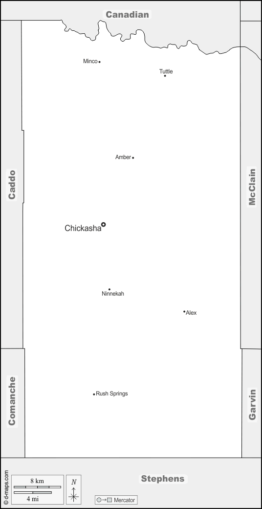 d-maps > संयुक्त राज्य > ओकलाहोमा > ग्रेडी काउंटी > सीमाओं, मुख्य शहरों, नाम
