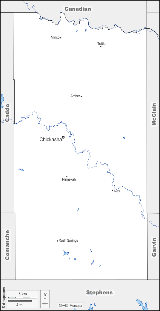 d-maps > संयुक्त राज्य > ओकलाहोमा > ग्रेडी काउंटी > सीमाओं, जल-सर्वेक्षण, मुख्य शहरों, नाम
