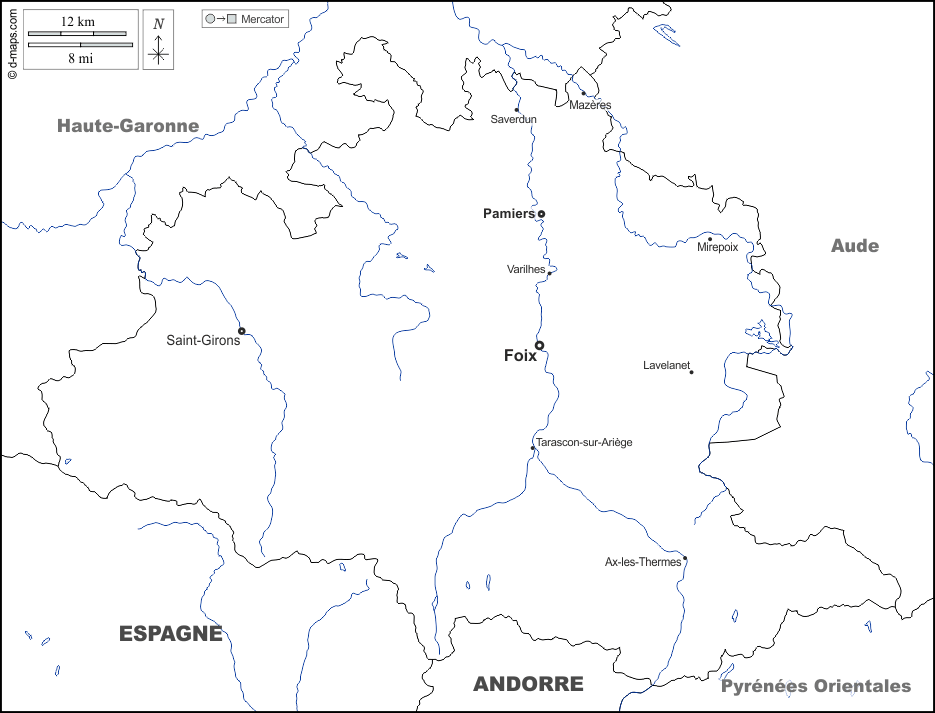 Europa > Francia > Ariège > frontiere, idrografia, principali città, nomi, bianco