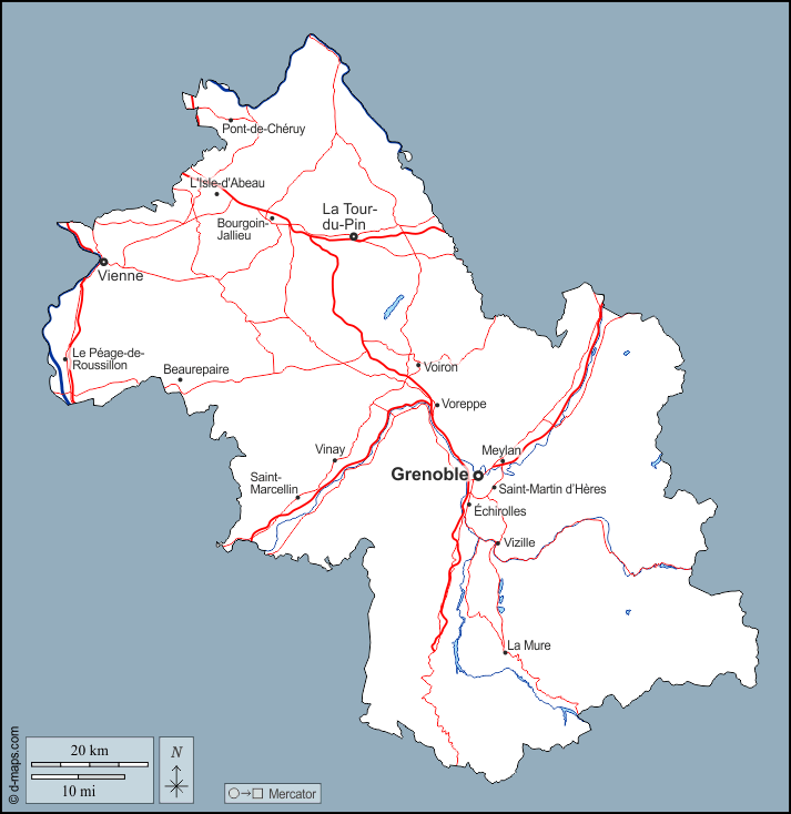 d-maps > Europa > Francia > Isère > contorni, idrografia, principali città, strade, nomi