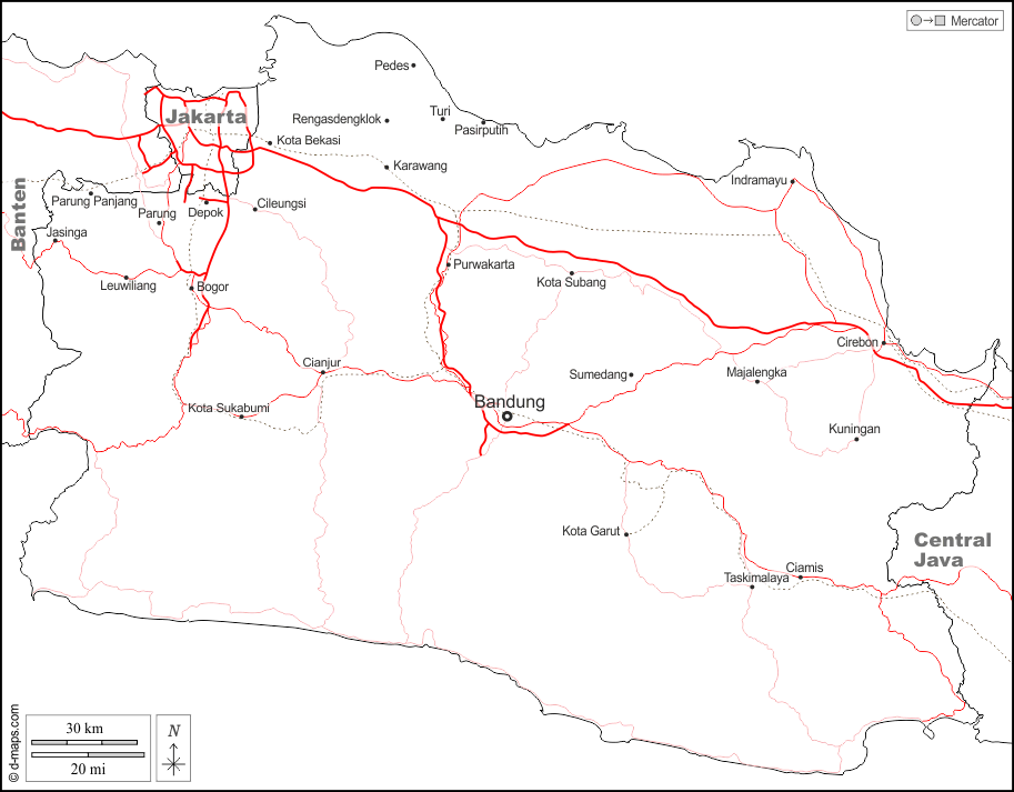d-maps > Asia > Indonesia > Giava Occidentale > frontiere, principali città, strade, nomi, bianco