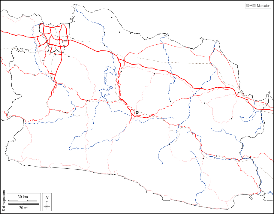 d-maps > Asia > Indonesia > Giava Occidentale > frontiere, idrografia, principali città, strade, bianco