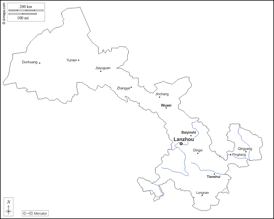 Asia > Cina > Gansu > contorni, idrografia, principali città, nomi, bianco