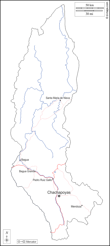 d-maps > Americhe > Perù > Amazonas > contorni, idrografia, principali città, strade, nomi, bianco