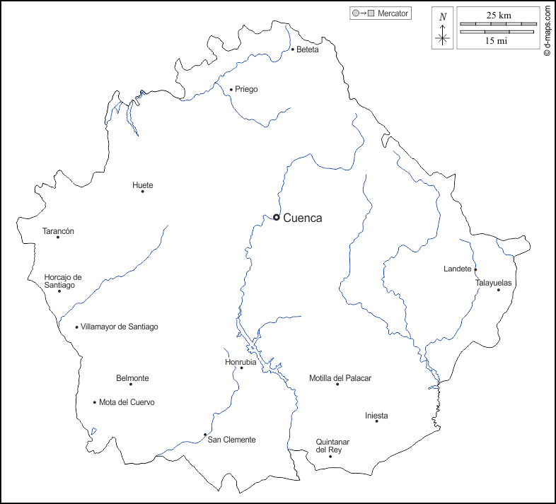 d-maps > Europa > Spagna > Cuenca > contorni, idrografia, principali città, nomi, bianco