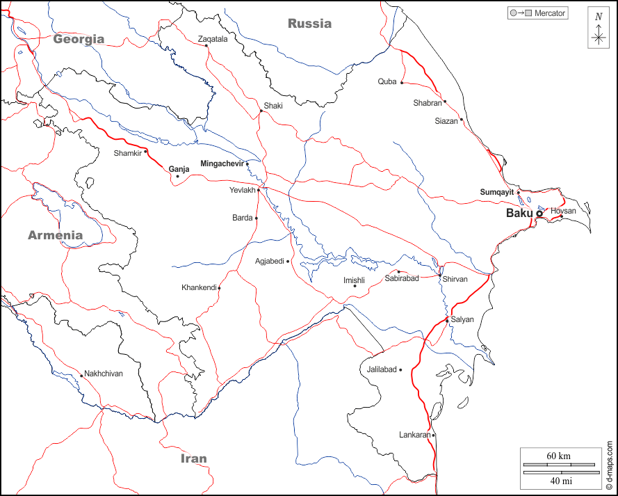d-maps > Asia > Azerbaigian > frontiere, idrografia, principali città, strade, nomi, bianco