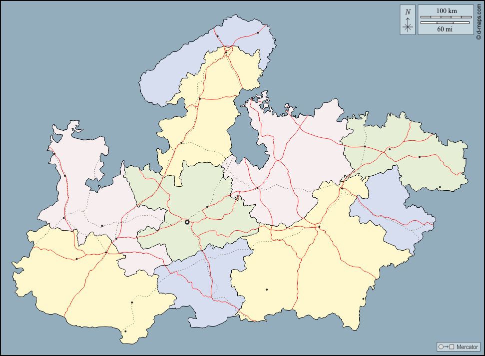 d-maps > Asia > India > Madhya Pradesh > contorni, divisioni, principali città, strade, colore