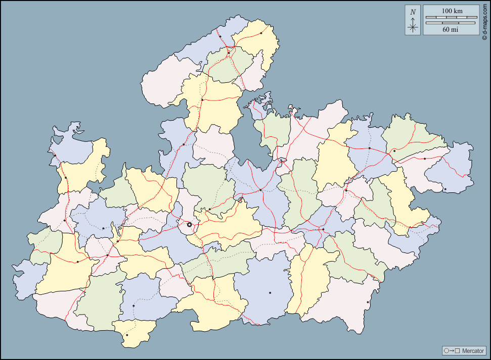d-maps > Asia > India > Madhya Pradesh > contorni, distretti, principali città, strade, colore
