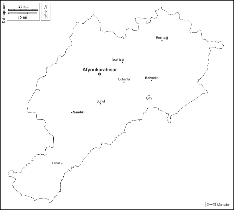 d-maps > Asia > Turchia > Afyonkarahisar > contorni, principali città, nomi, bianco