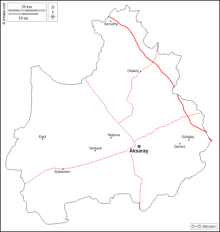 d-maps > Asia > Turchia > Aksaray > contorni, principali città, strade, nomi, bianco
