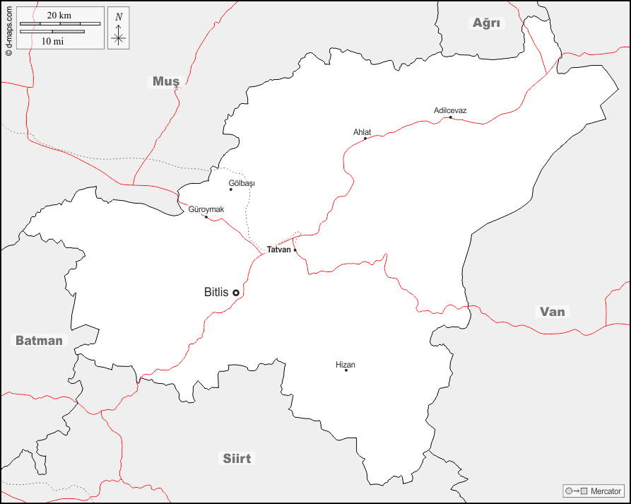 d-maps > Asia > Turchia > Bitlis > frontiere, principali città, strade, nomi