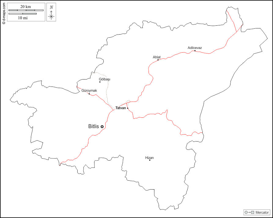 d-maps > Asia > Turchia > Bitlis > contorni, principali città, strade, nomi, bianco