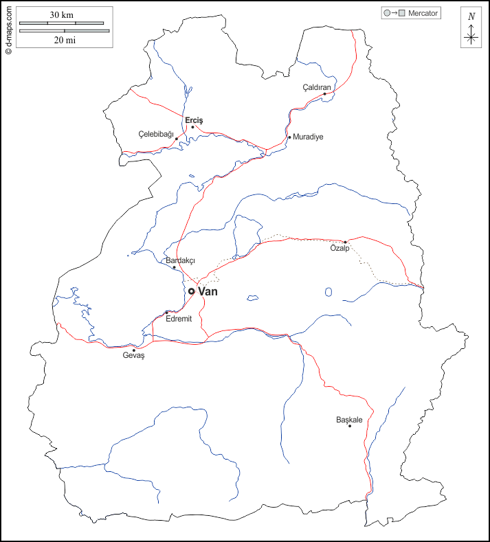 d-maps > Asia > Turchia > Van > contorni, idrografia, principali città, strade, nomi, bianco