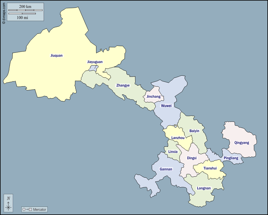 Asia > Cina > Gansu > contorni, prefetture, nomi, colore