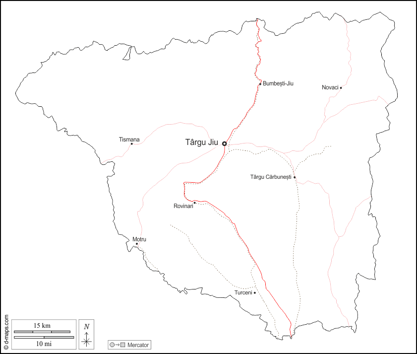 d-maps > Europa > Romania > Gorj > contorni, principali città, strade, nomi, bianco