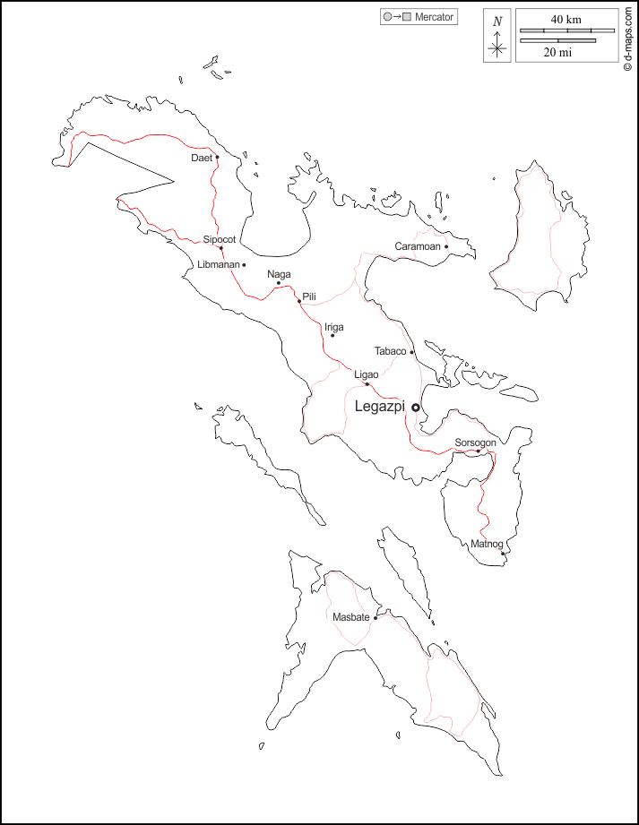 d-maps > Asia > Filippine > Bicol > contorni, principali città, strade, nomi, bianco