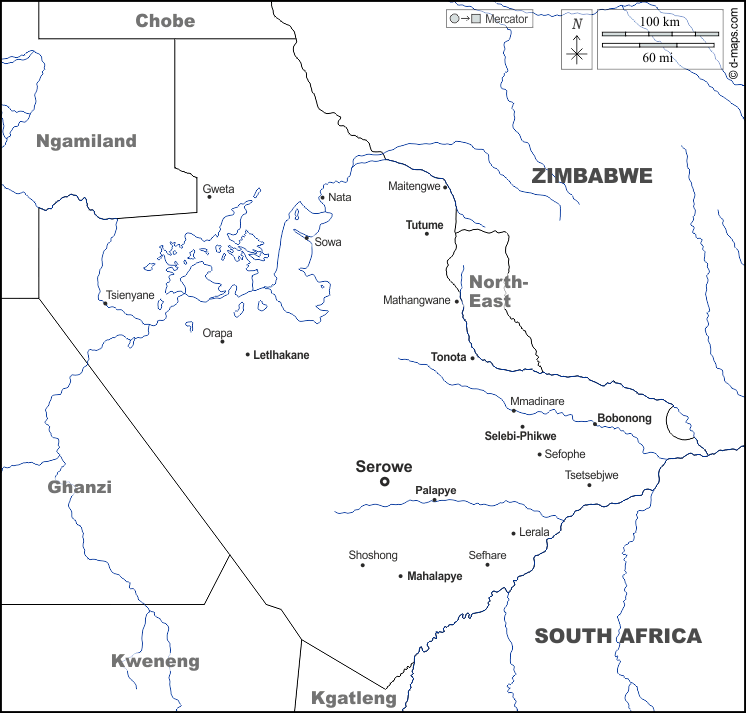Africa > Botswana > Distretto Centrale > frontiere, idrografia, principali città, nomi, bianco