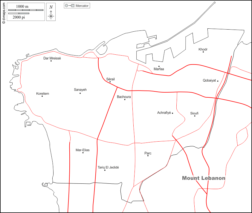 d-maps > Asia > Libano > Beirut > frontiere, principali città, strade, nomi, bianco