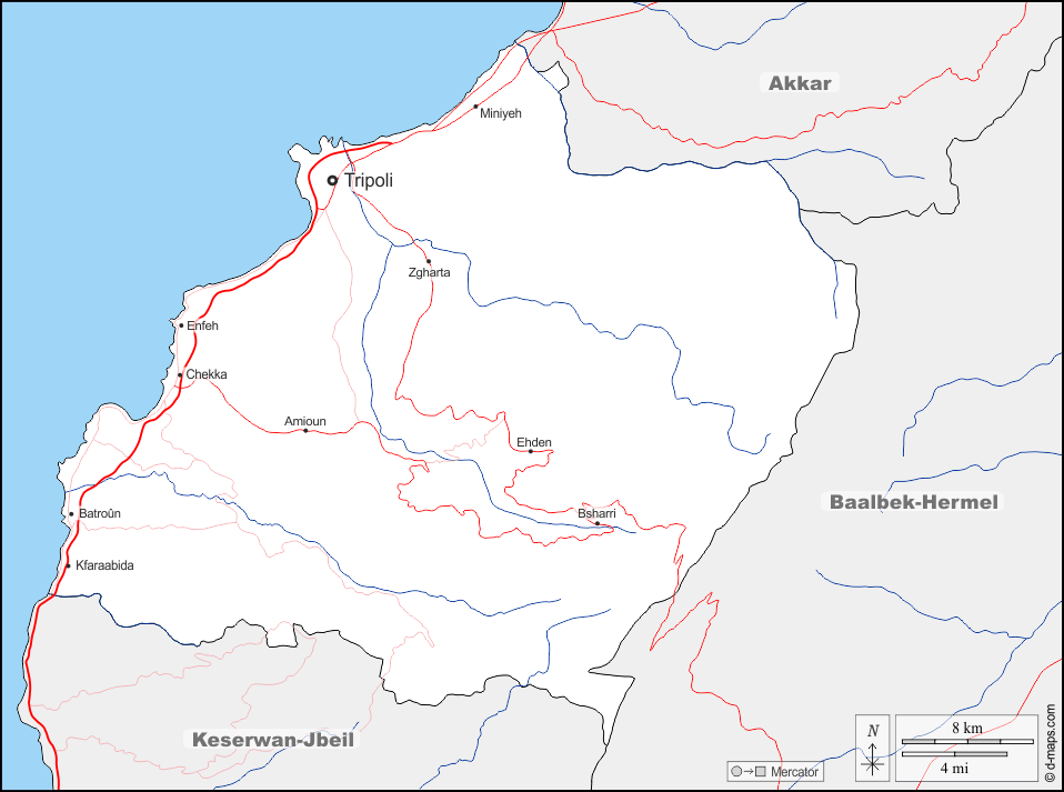 Asia > Libano > Nord Libano > frontiere, idrografia, principali città, strade, nomi