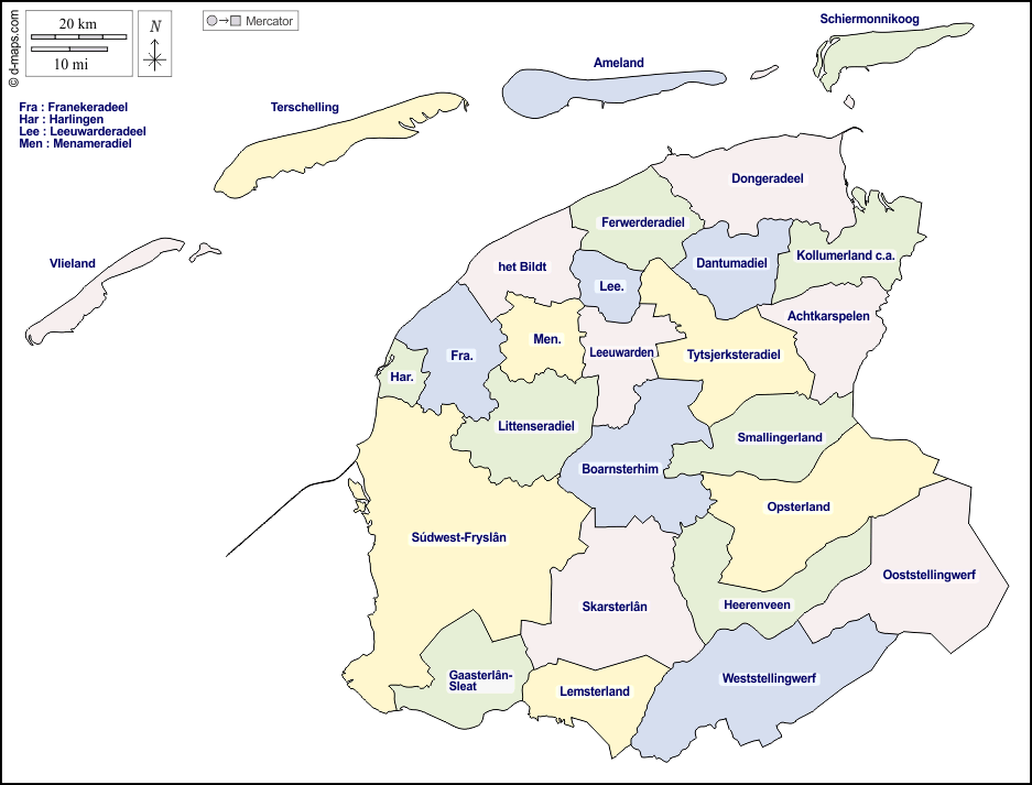 Achtkarspelen, Ameland, Boarnsterhim, Dantumadiel, Dongeradeel, Ferwerderadiel, Franekeradeel, Gaasterlân-Sleat, Harlingen, Heerenveen, Kollumerland c.a., Leeuwarden, Leeuwarderadeel, Lemsterland, Littenseradiel, Menameradiel, Ooststellingwerf, Opsterland, Schiermonnikoog, Skarsterlân, Smallingerland, Súdwest-Fryslân, Terschelling, Tytsjerksteradiel, Vlieland, Weststellingwerf, het Bildt.