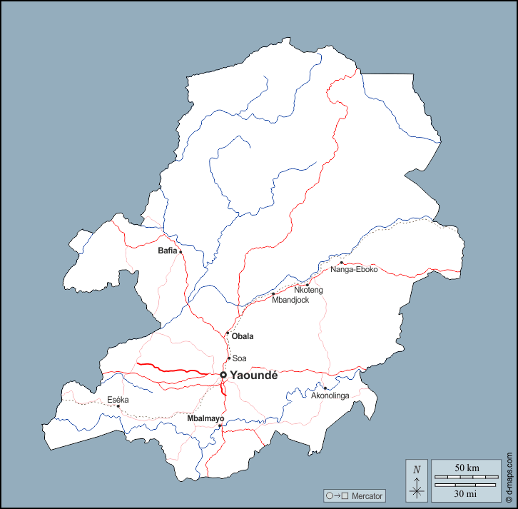 d-maps > Africa > Camerun > Regione del Centro > contorni, idrografia, principali città, strade, nomi
