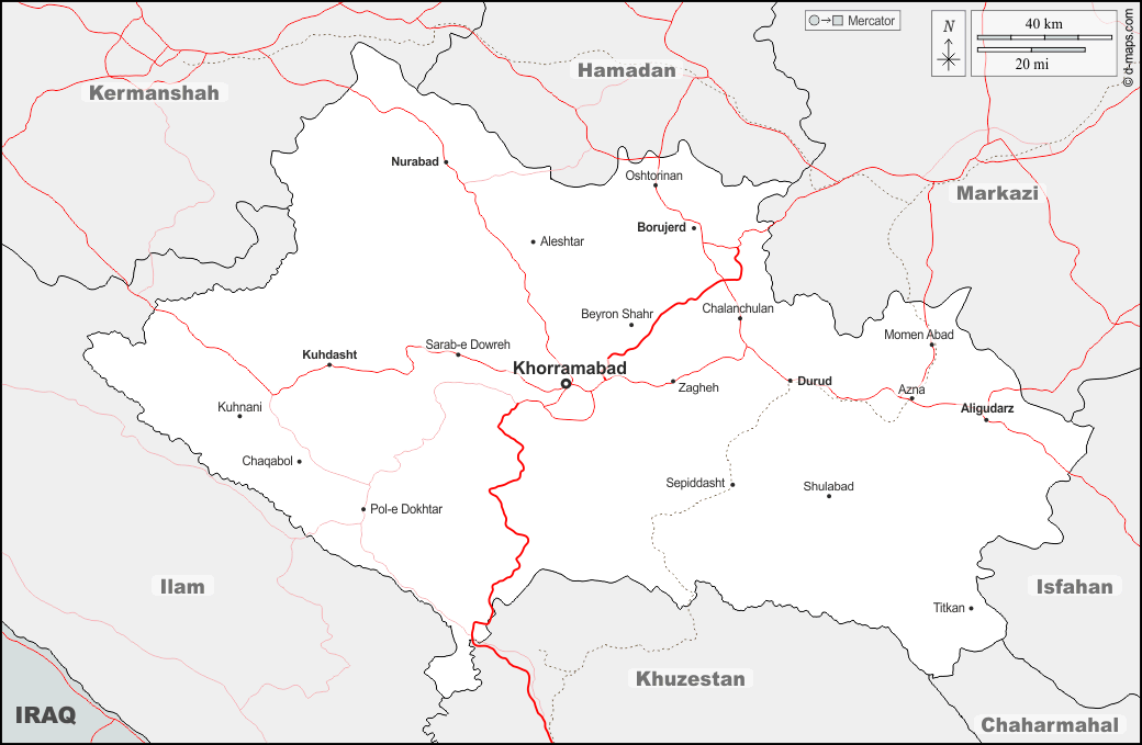 d-maps > Asia > Iran > Lorestan > frontiere, principali città, strade, nomi